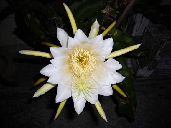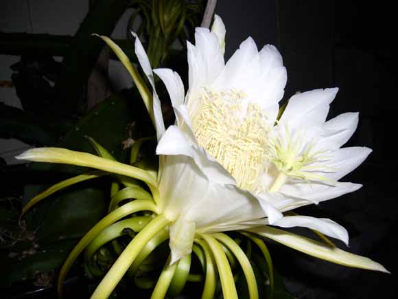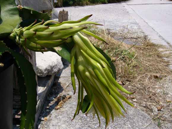 花の形もおもしろく、タコの風船あるいはお弁当のウインナーソーセージを連想させる顎であり、花弁は淡黄白色。