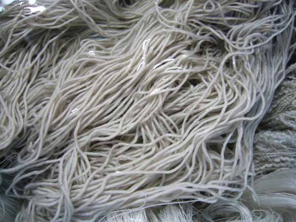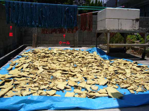 干してあるのは留守にしてる間、仲間が染めてくれた藍とクール(紅露、和名はソメモノイモ)。