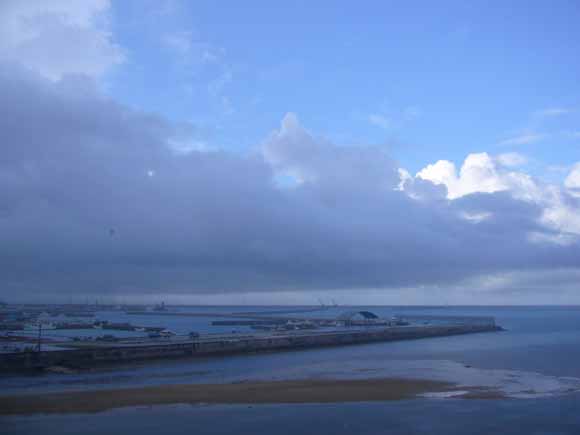 左側の黒い雲が雨雲。右側に青空。