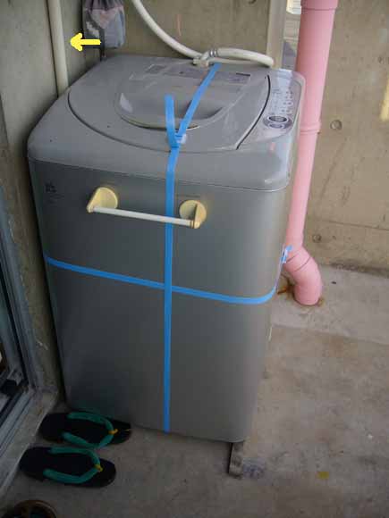 ベランダ据え置きの洗濯機は、壁に取り付けられてる(矢印の部分)エアコンの配水管に固定。