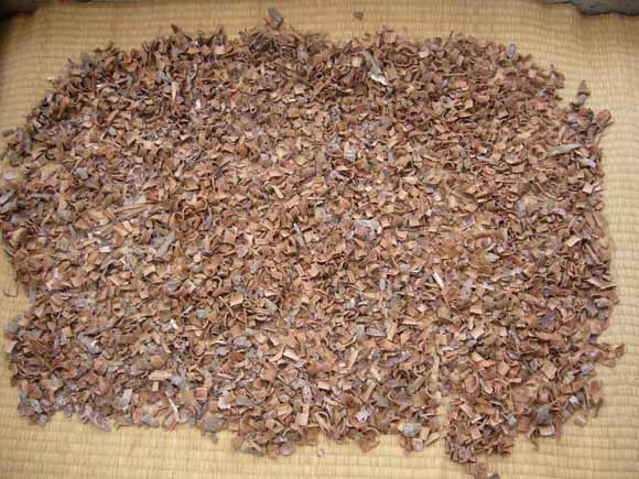 こんな実のなる木を剪定したので、皮をはいで染めてみた。