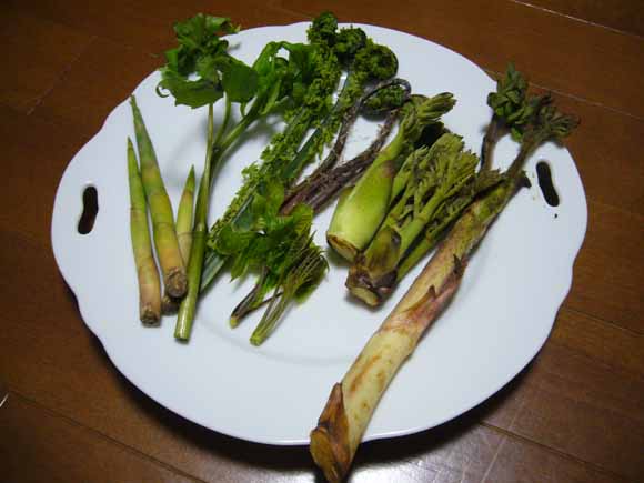 根曲がり竹は煮物、しどけ・こごみ・あかこごみはお浸し、コシアブラ・タラの芽・こごみは天ぷら、ウドの皮と葉先はお味噌汁・皮をむいた白い部分は酢味噌和え。