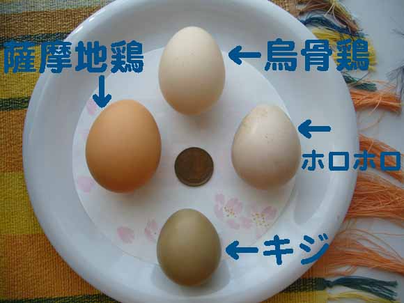 ここから時計回りに、烏骨鶏(うこっけい)の卵・ホロホロ鳥の卵・キジの卵だそうな。