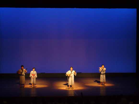上手(右)に笛、センターが謡手、下手(左)があいのて&三線。
